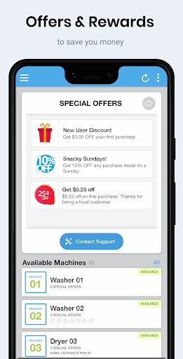 Find a supported machine, open the app, locate it, swipe left or right to select, then swipe up to pay—fast and contactless.