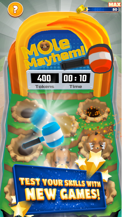 Play mini games and complete levels to earn tokens, then redeem tokens for sweepstakes entries, all available from the sweepstakes section accessible from the home screen.