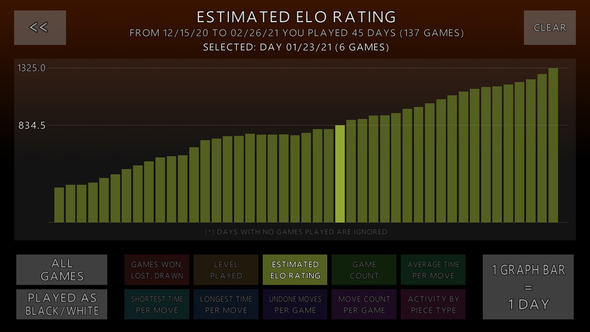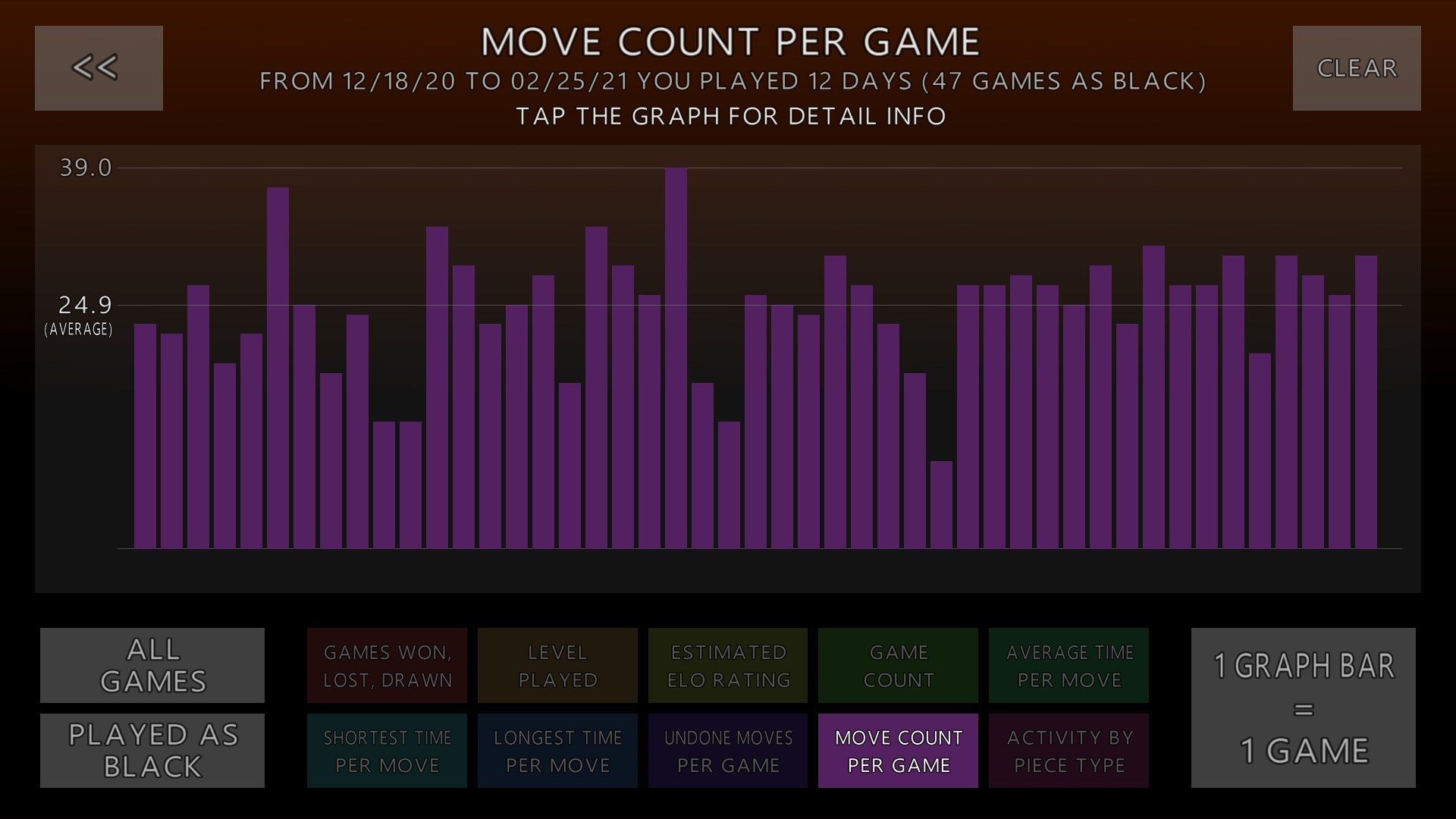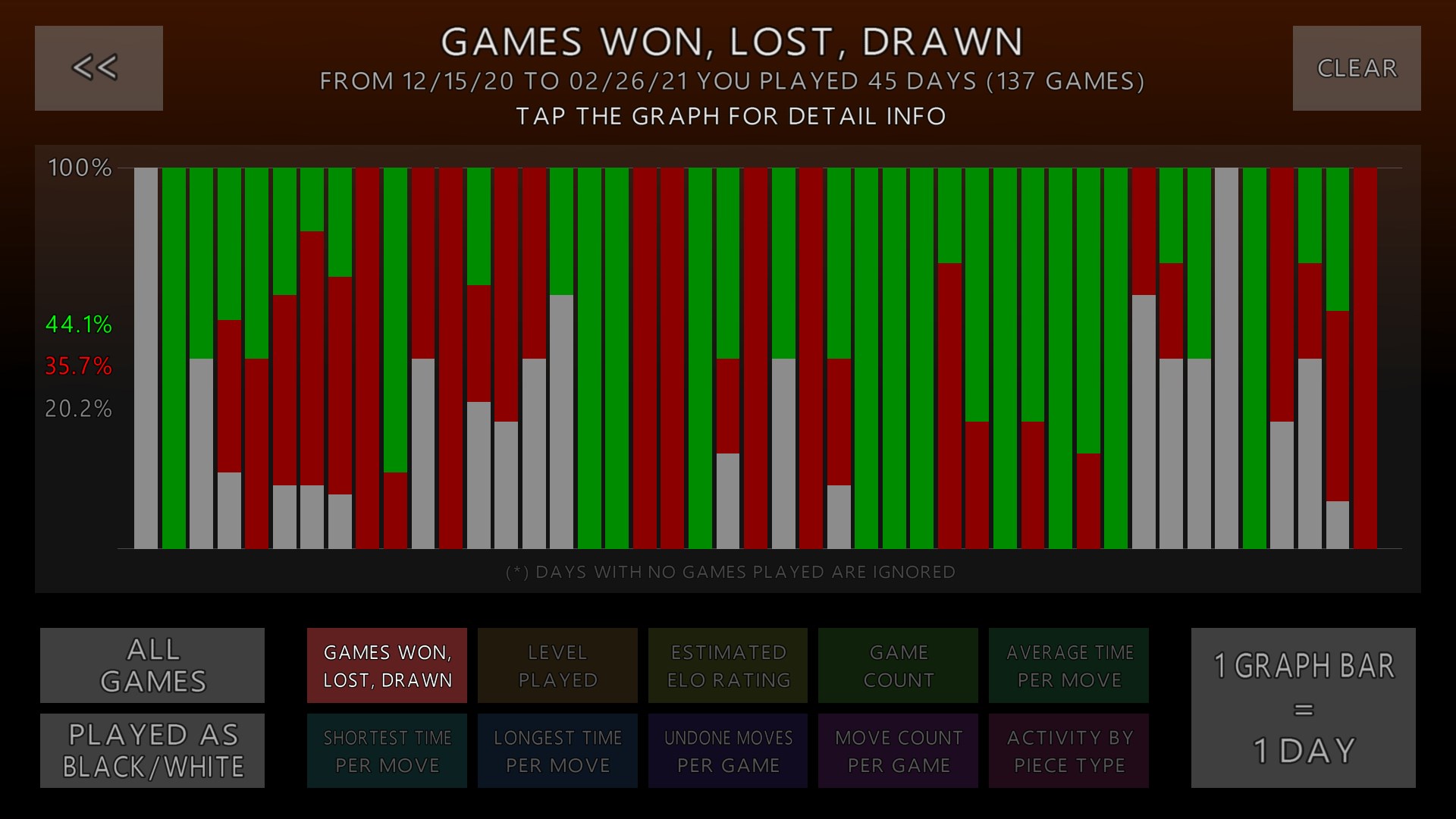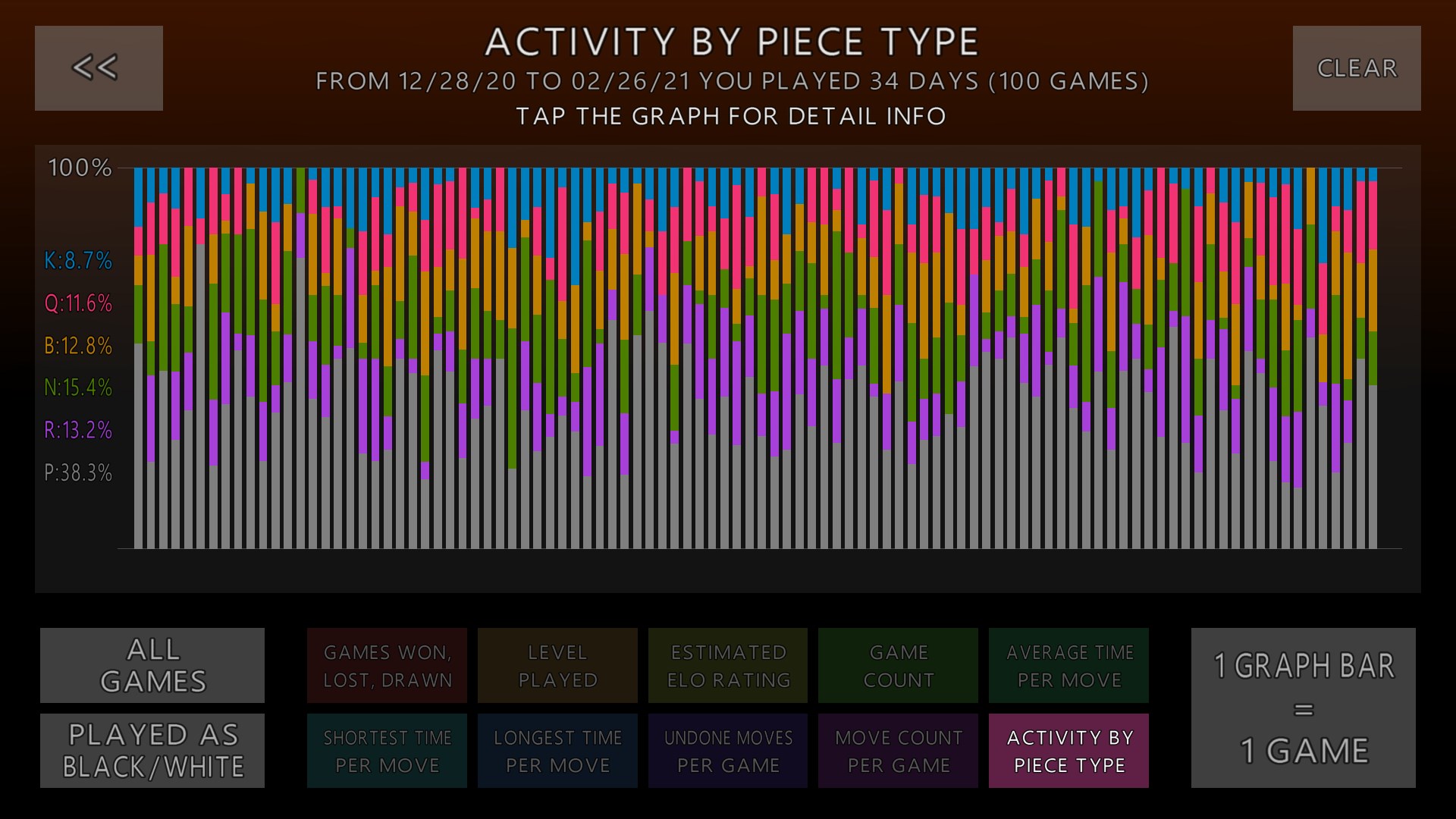 After playing, go to 'Statistics' in the main menu to see your ELO ratings, piece activity, and detailed game analysis over different periods.
