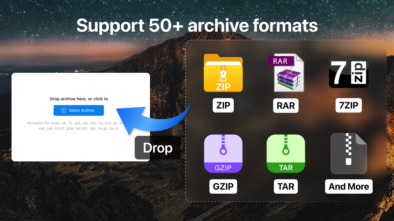 AukZip supports most formats including ZIP, RAR, 7Z, TAR, GZIP, ISO, DMG, VHD, and more. It automatically detects formats when opening files.