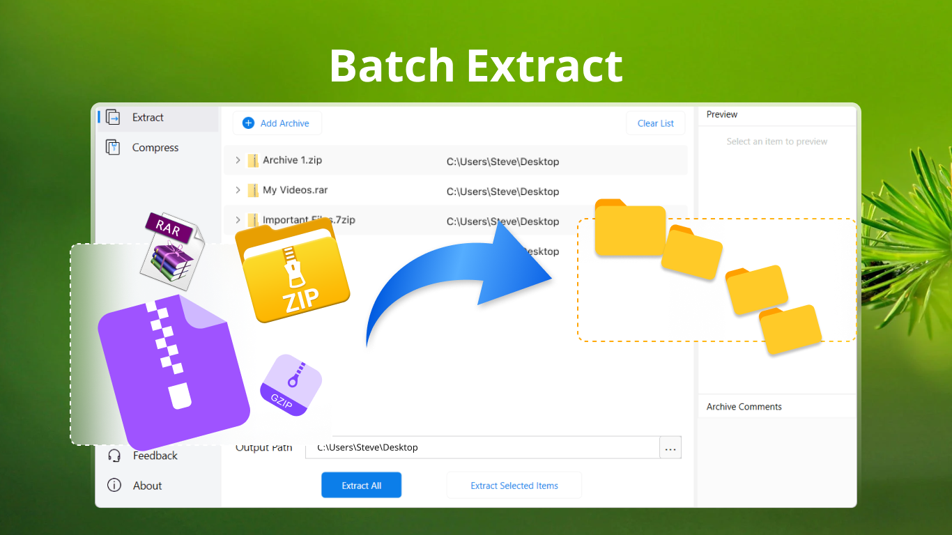 Select files in your file explorer, drag them into AukZip, or use the 'Batch Compress' option under the app's menu to create a new archive.