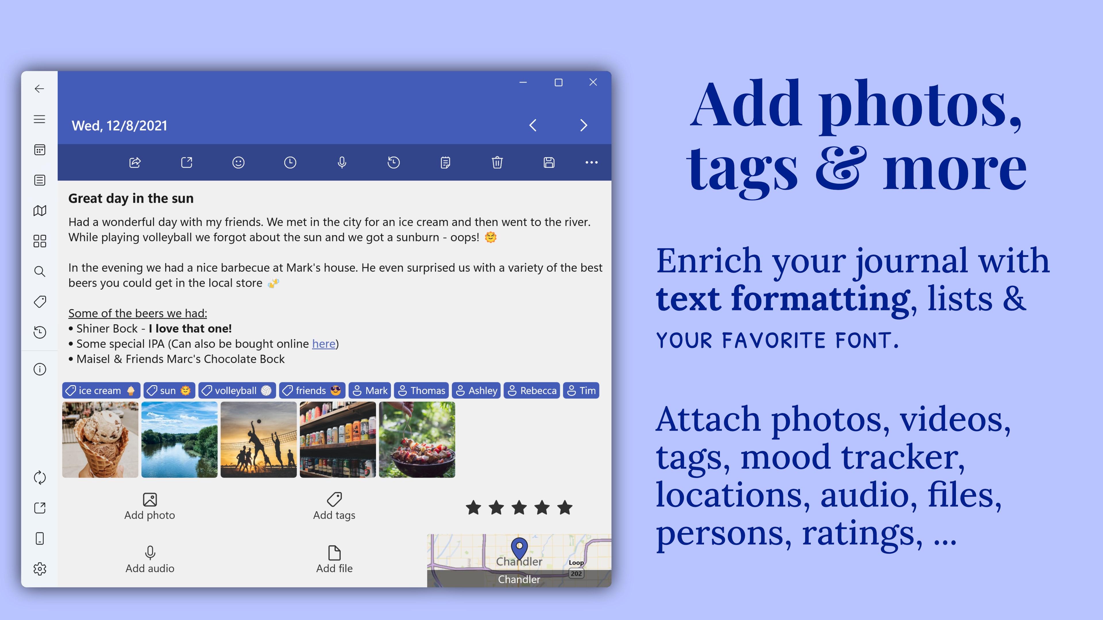 Allows embedding images, audio, and video, enriching diary entries with multimedia content.