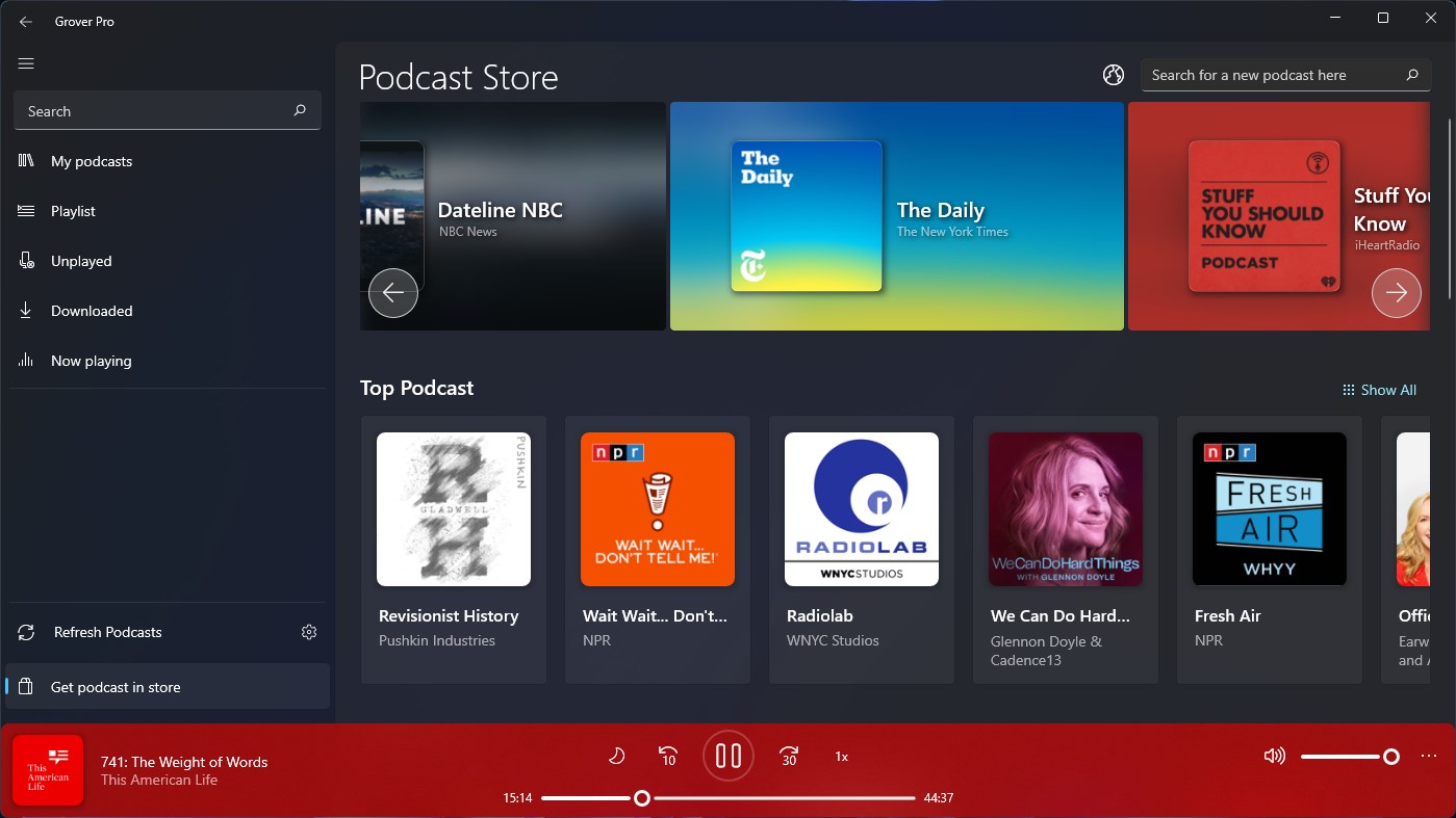 Download and install Grover Pro from the official store. Launch the app, sign in with your account, and set up your podcast subscriptions via Settings > Subscriptions.