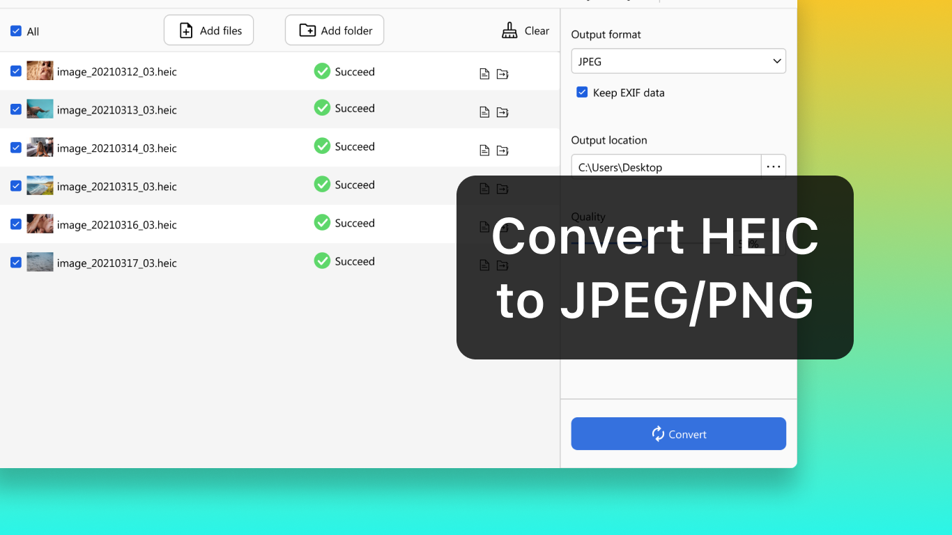 Select your HEIC files, tap 'Convert,' choose JPEG or PNG as output, then confirm to start the conversion from the main menu.