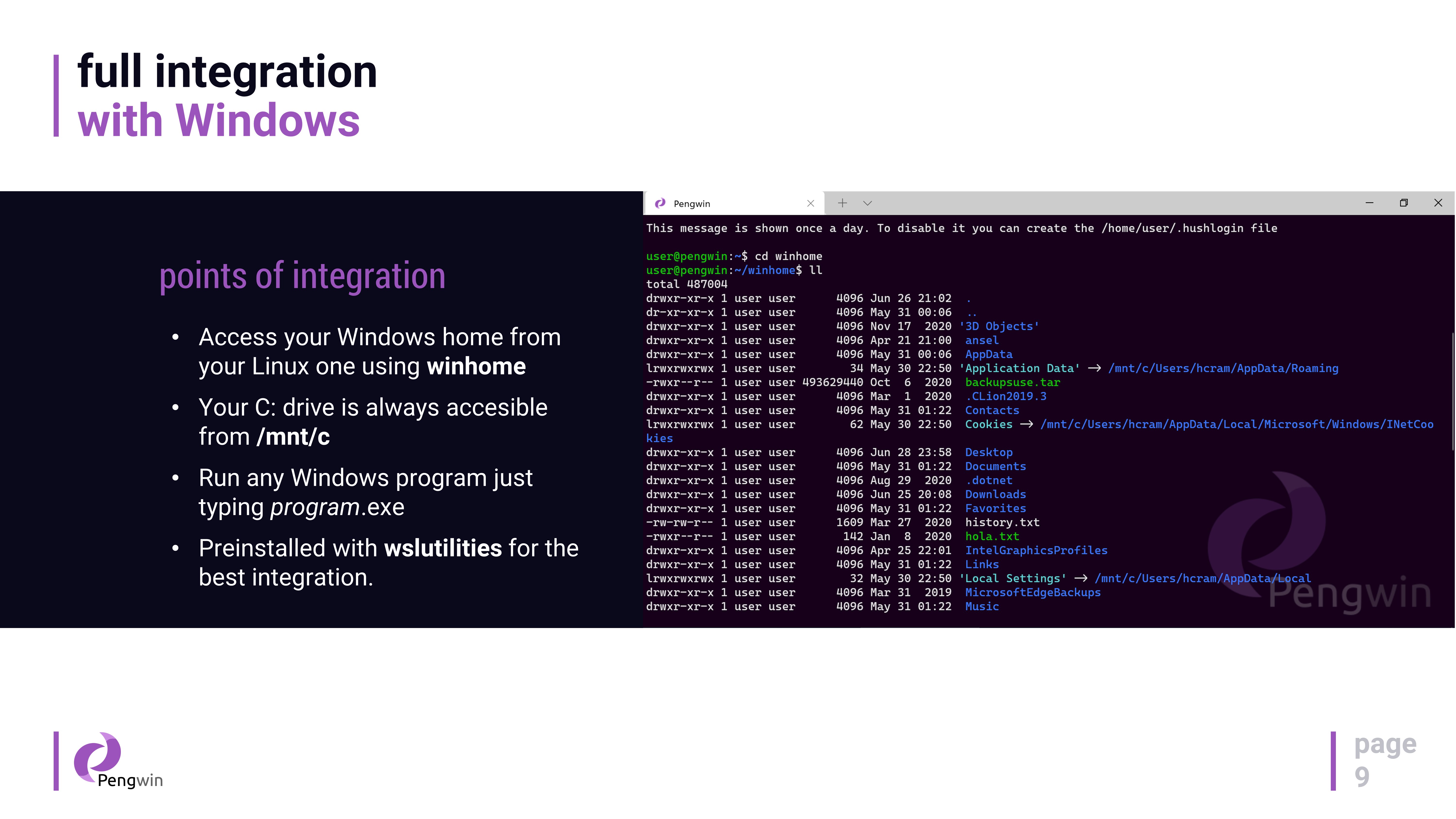 What sets Pengwin apart from other Linux-for-Windows tools, such as WSL or traditional VMs, are its optimizations and user-centric design choices. Unlike basic WSL installations, Pengwin offers pre-configured, curated Linux distributions with extra tools and support, saving time and reducing setup complexity. Its focus on integration—allowing users to open files, run Linux commands, and share data with Windows without cumbersome workarounds—provides a cohesive experience that feels less like running two systems side by side and more like operating within a unified interface.