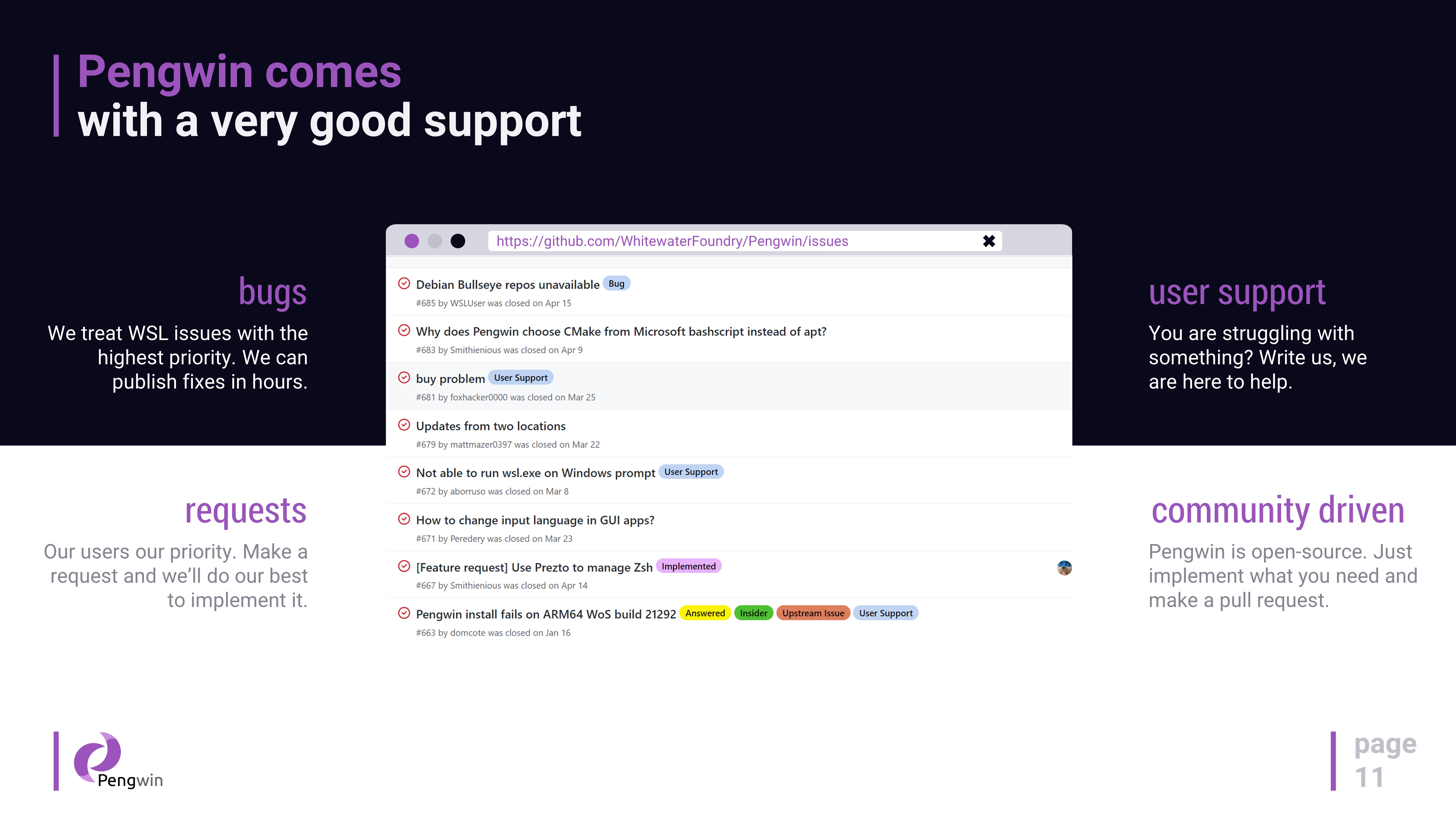 Created by Whitewater Foundry, Ltd. Co., Pengwin is the company's flagship solution, reflecting their expertise in integrating Linux into other platforms. With a focus on delivering a polished, secure, and optimized Linux subsystem, Whitewater Foundry brings years of experience in streamlining cross-platform development, ensuring Pengwin users enjoy a reliable environment for their coding, development, or general Linux exploration.