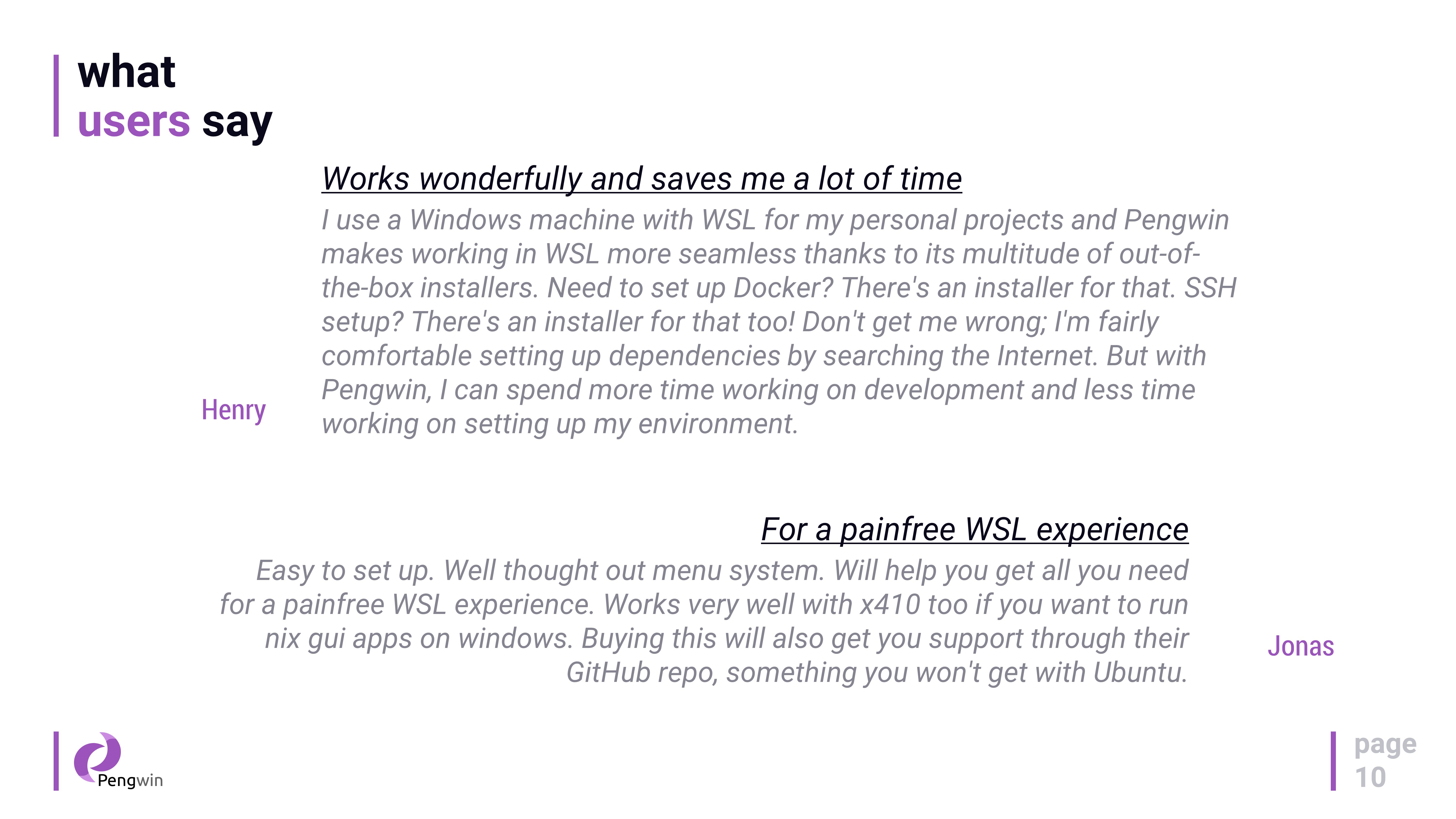 Overall, Pengwin for Windows is a compelling choice for developers, sysadmins, or Linux enthusiasts who seek a robust, integrated Linux shell directly within Windows. It's particularly suited for users who need frequent access to Linux tools but prefer not to juggle multiple virtual machines or dual boot setups. For pure beginners, Pengwin's simplicity and support make onboarding quite manageable.