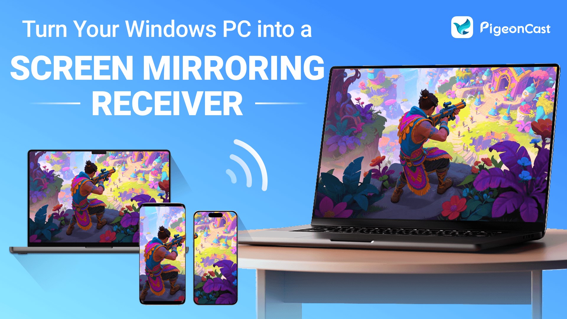Install PigeonCast, connect both devices to the same Wi-Fi, open the app, and select your PC as the AirPlay device to begin mirroring.