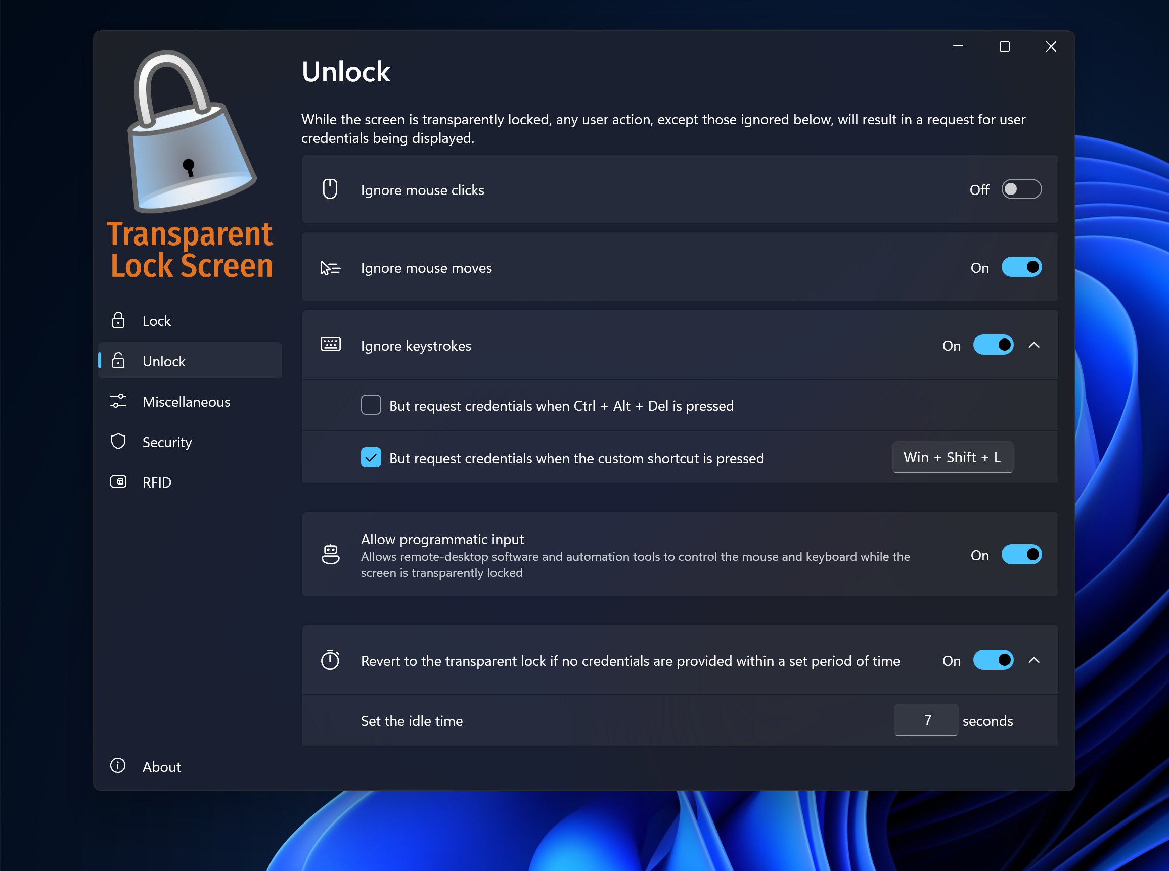 Unlock options include mouse click, movement, pressing any key, Ctrl + Alt + Del, or a custom shortcut like Win + Shift + L, configured in Settings.