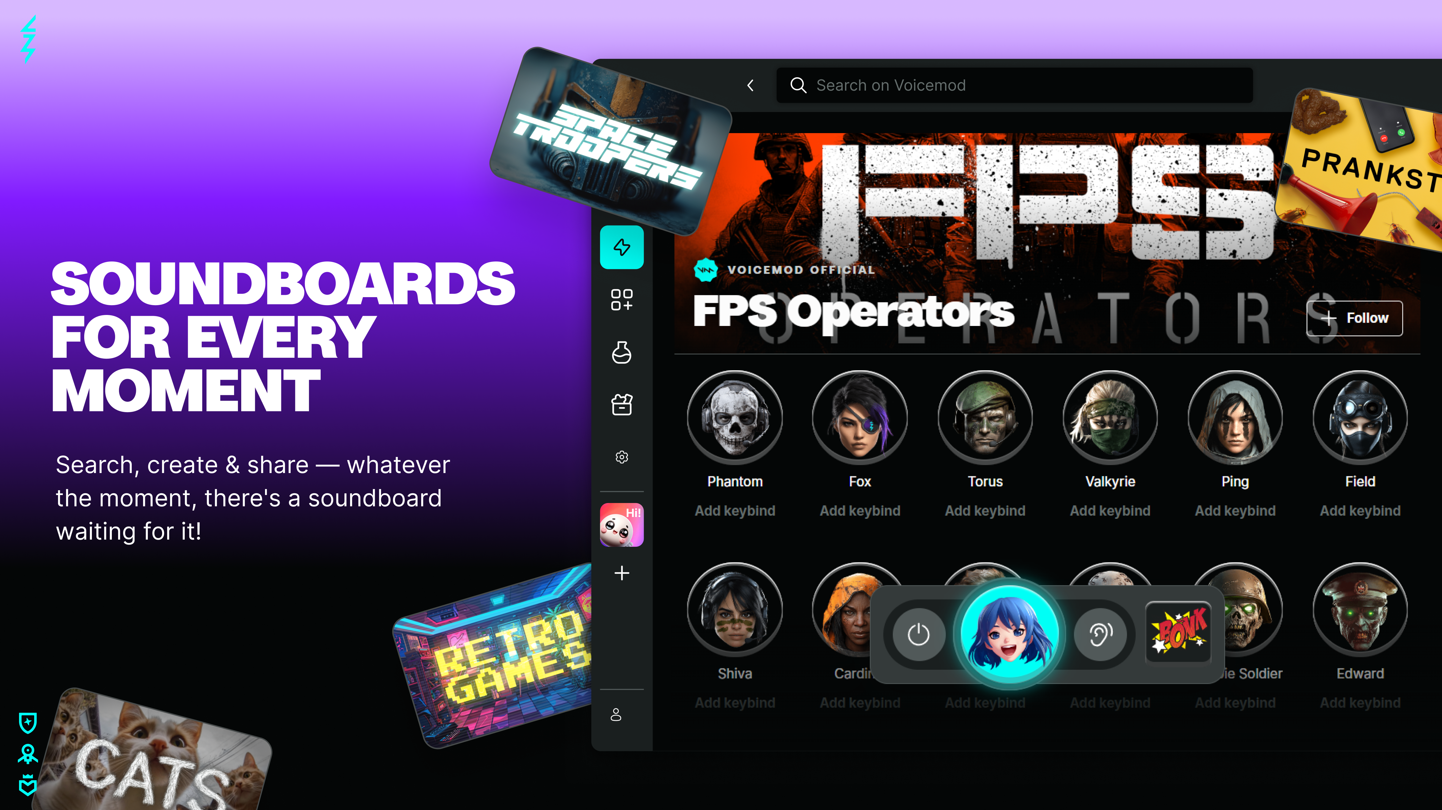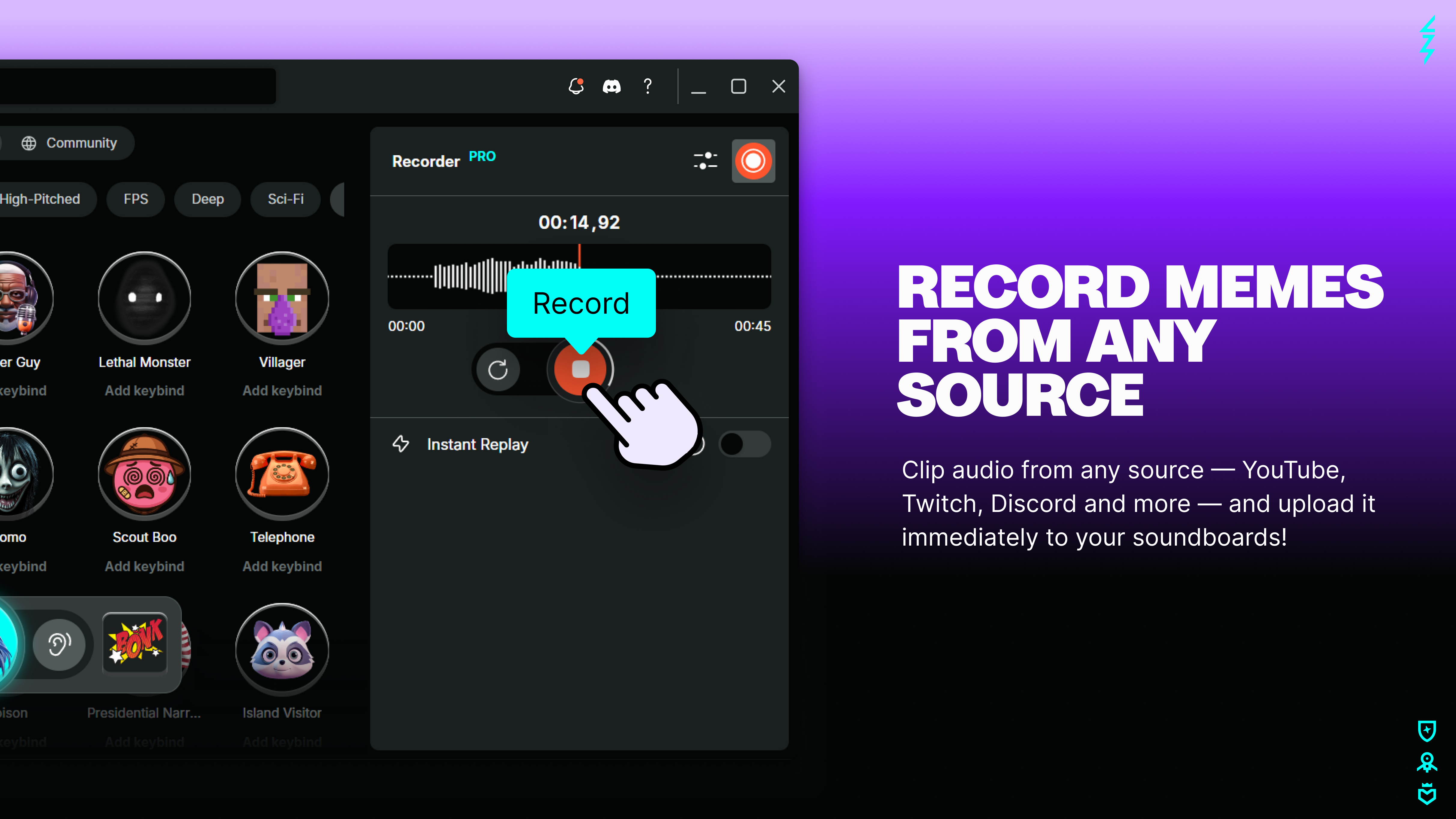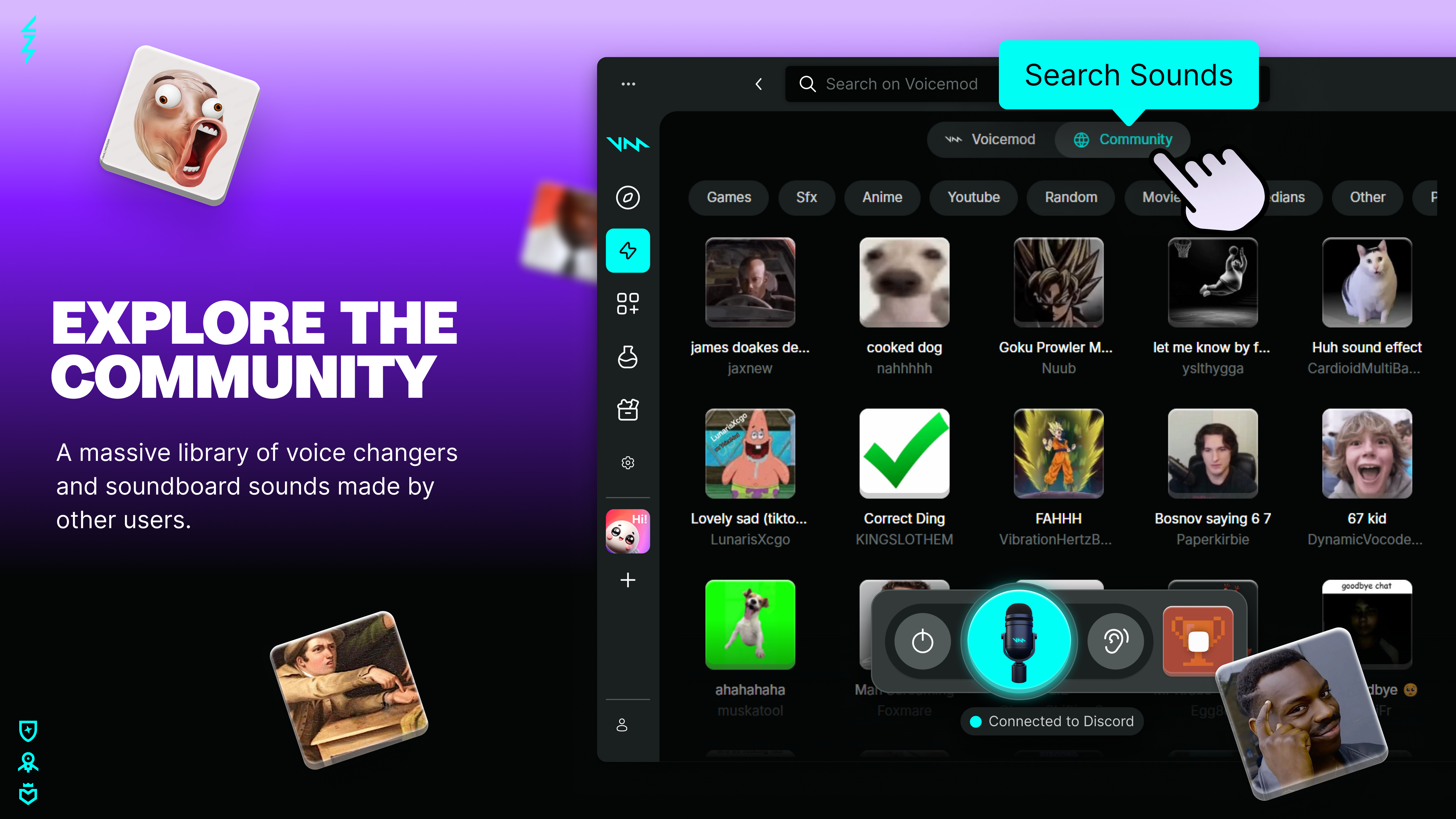 Voicemod offers over 150 real-time AI voices and an unlimited soundboard for effects, plus over 3000 community voices available for download.